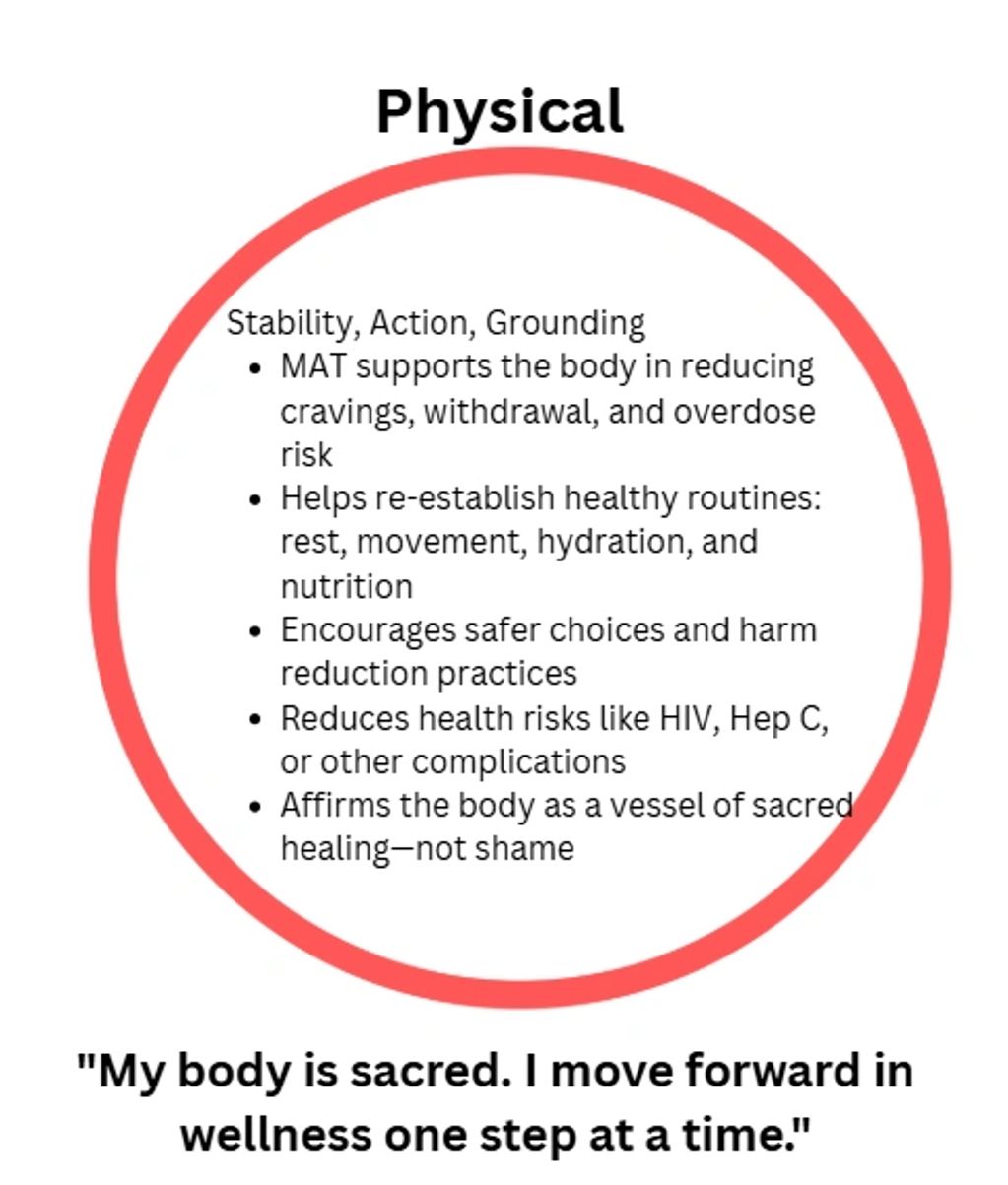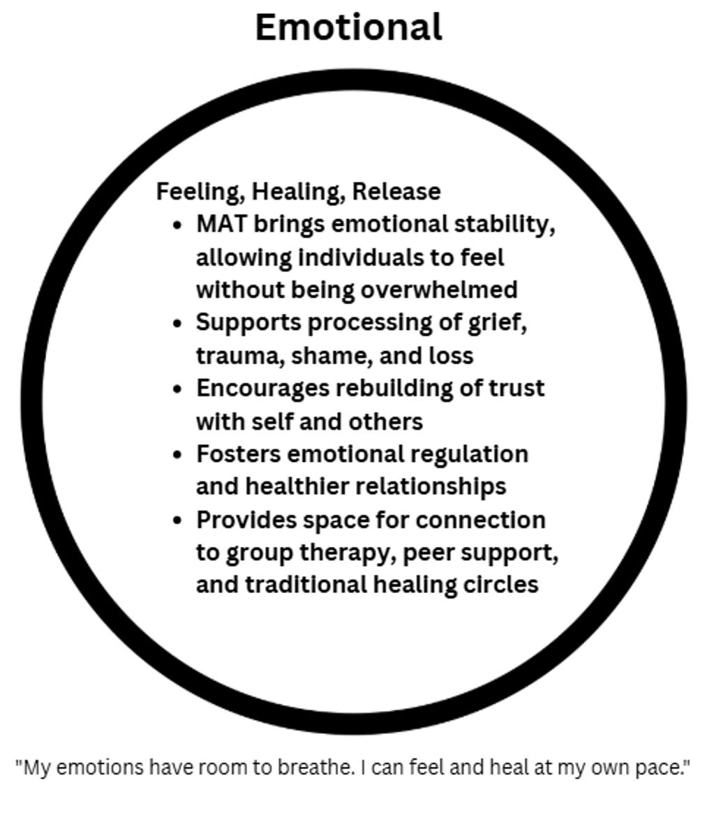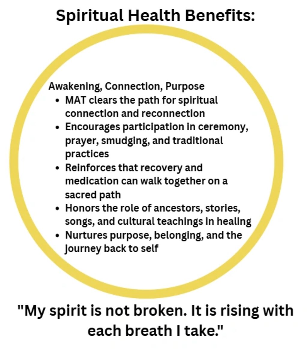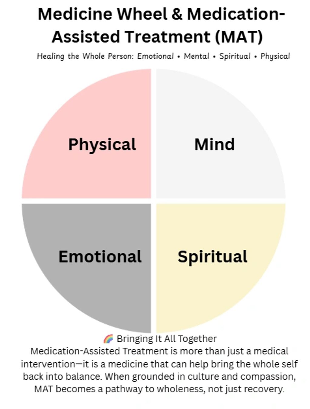 In medicine wheel teachings, healing must be balanced across the physical, emotional, mental, and spiritual aspects of life. Medications for Addiction Treatment (MAT) are more than just a prescription for the physical body — they can help restore balance across all four directions.